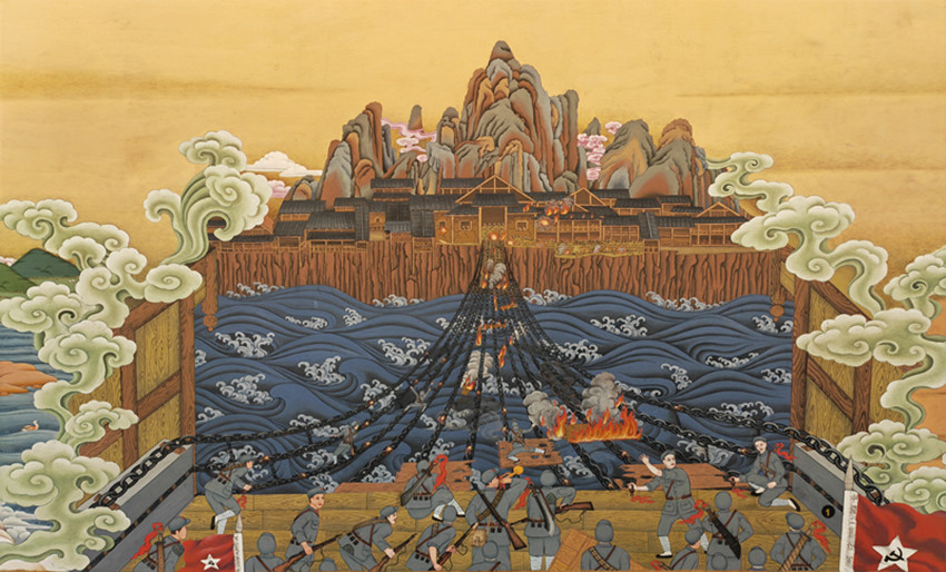巨幅唐卡《紅星照耀雪域》中的飛奪瀘定橋場景?!凹t色非遺根植中華文化故土,富含深刻的革命文化,它代表了中華文化中先進的、優(yōu)秀的部分,紅軍長征更是文學藝術(shù)創(chuàng)作取之不盡用之不竭的源泉。[詳細] -