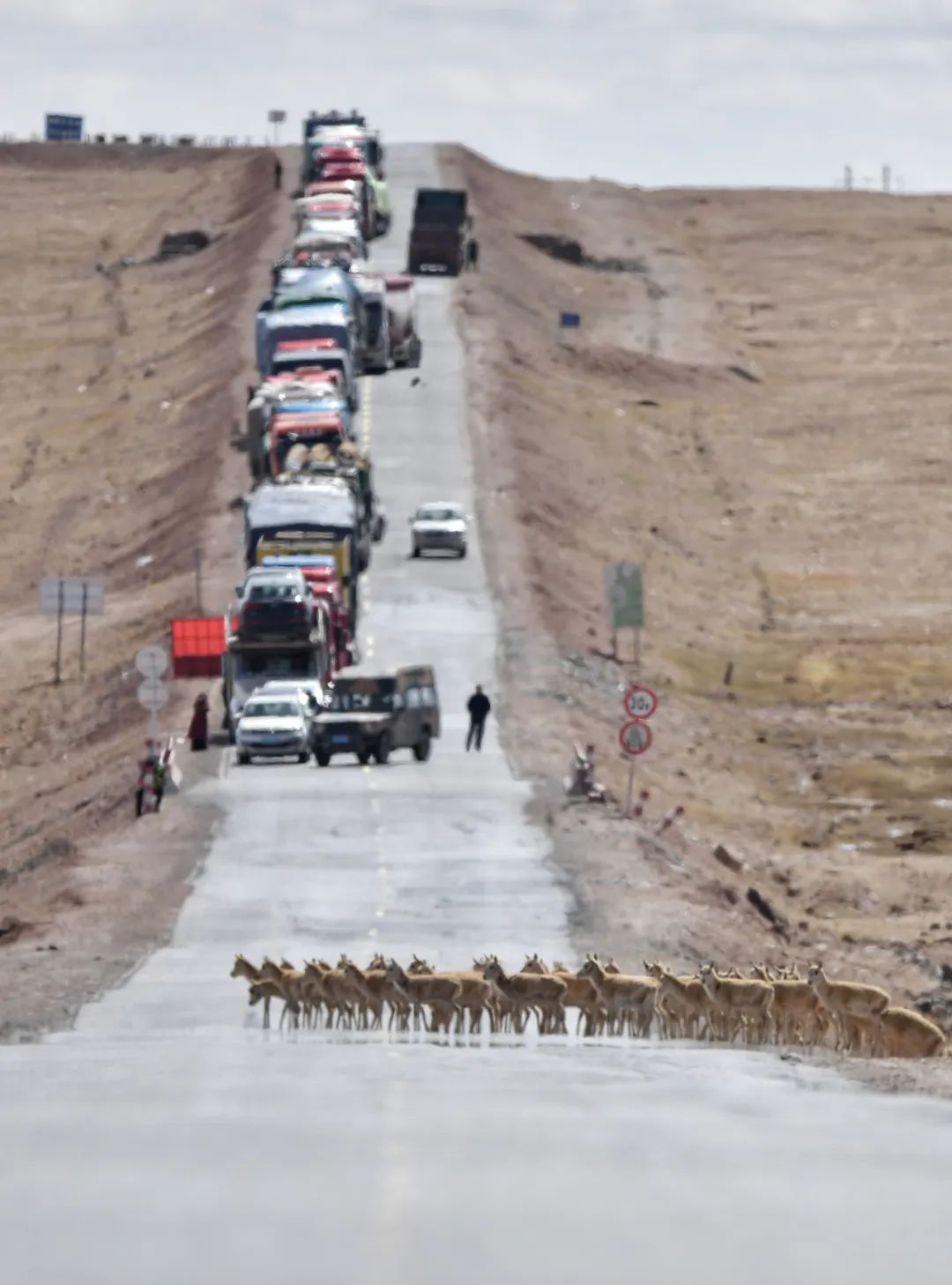 遷徙藏羚羊群經過青藏公路可可西里五道梁路段。