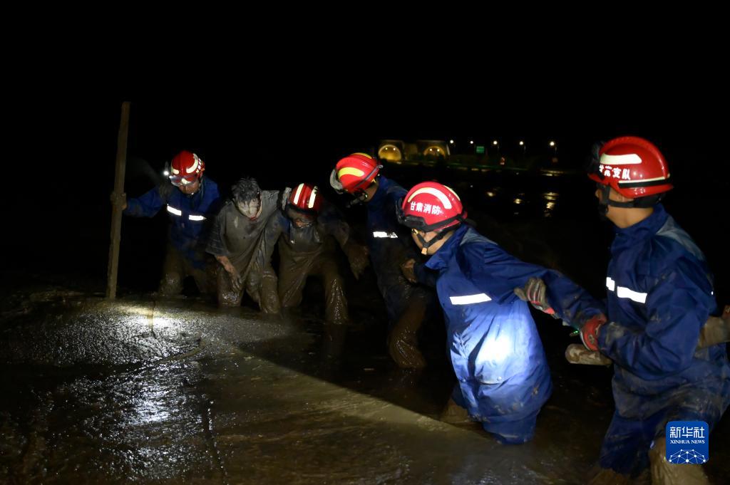 7月11日凌晨,當?shù)鼐仍α吭陂_展人員搜救工作。新華社發(fā)(夏河縣消防救援大隊供圖)