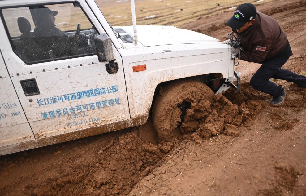 “糟糕,陷車了?!鳖嶔で靶辛艘粋€多小時后,我們的車還是陷在了爛泥灘里。隊員們熟練地戴好手套、拿起鐵锨,開始忙活。