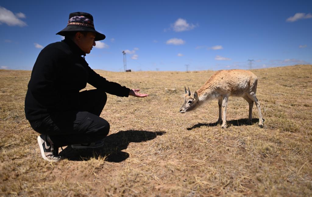 在可可西里國家級自然保護區(qū)索南達杰保護站,巡山隊員扎西桑周在野生動物救助中心內與一只被救助的小藏羚羊互動(5月30日攝)。新華社記者 張宏祥 攝