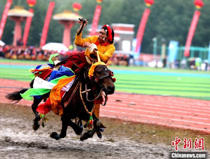 圖為玉樹(shù)傳統(tǒng)賽馬會(huì)現(xiàn)場(chǎng)的馬術(shù)表演。薛蒂 攝