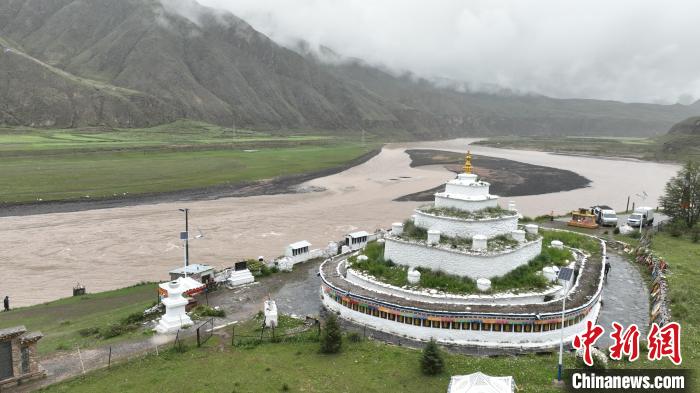 連日來(lái)雨水持續(xù),清晨的通天河挾卷泥沙,波濤涌動(dòng),河中央的月牙形沙洲被沖刷出柔美的弧線。四周群山青翠、霧靄繚繞,白塔靜靜佇立在古渡口邊,似水墨畫頗具詩(shī)意。石階延伸處,牧人緩緩走過(guò)轉(zhuǎn)經(jīng)筒,遠(yuǎn)處村莊籠罩在一片朦朧中。