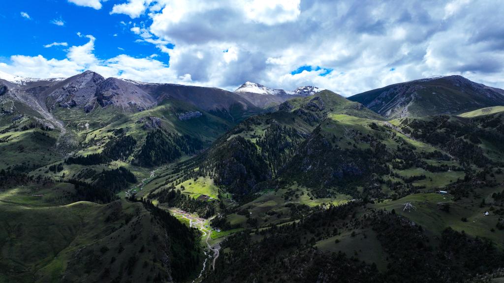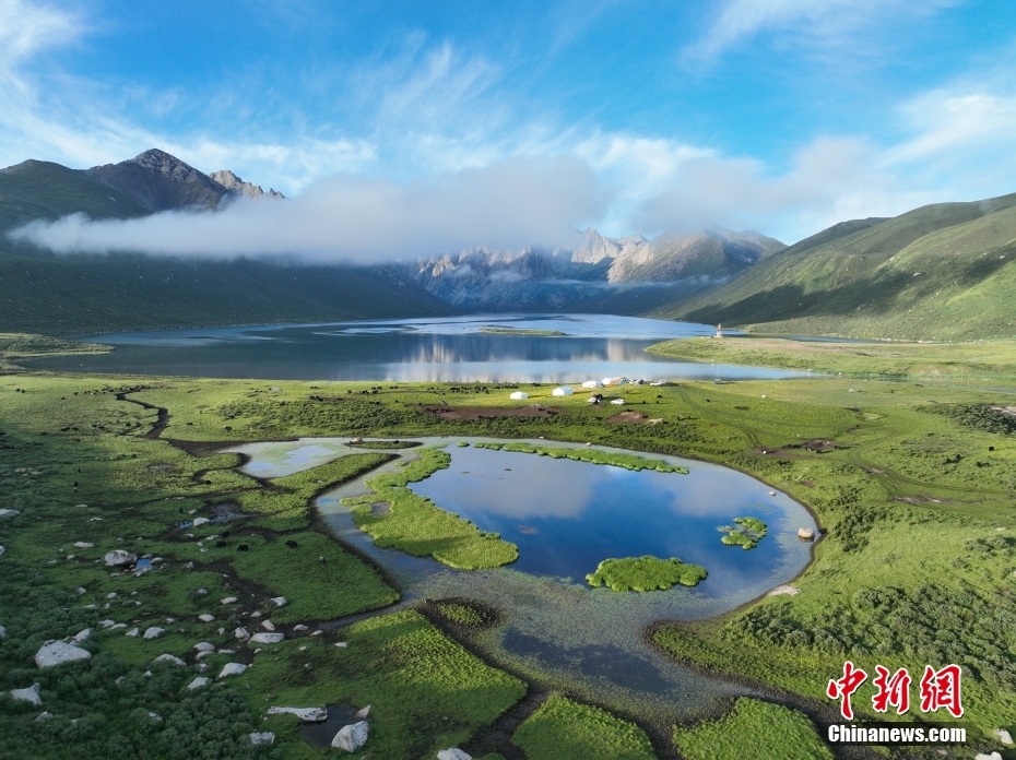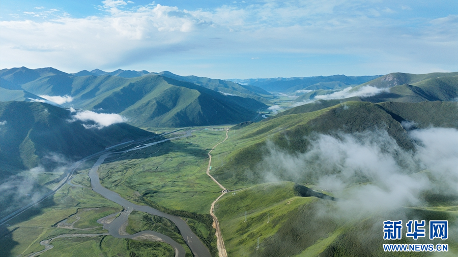圖為在青海省果洛藏族自治州甘德縣境內(nèi)拍攝的夏日風(fēng)光(無(wú)人機(jī)照片)。新華網(wǎng) 宋忠勇 攝