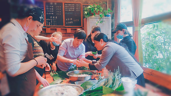 在央切爾鍋莊,藏族店員和漢族客人一起過端午,包粽子。受訪者供圖