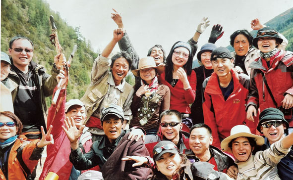 塔公村村長尼瑪降澤(手舉最高者)早年與客人們的合影。王京雪翻 拍