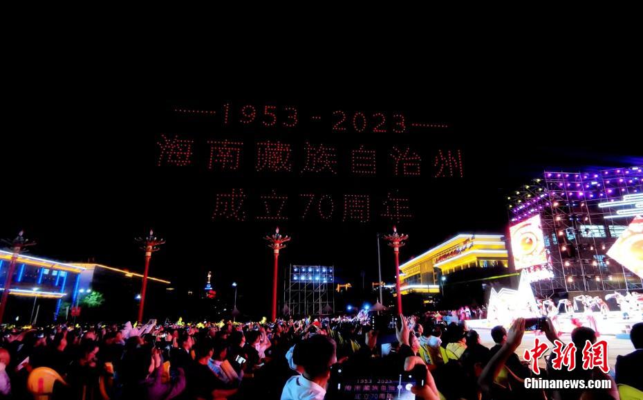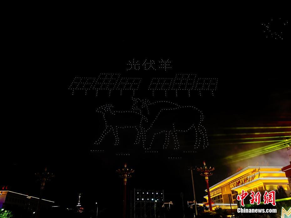 7月31日晚,青海省海南藏族自治州,800余架無人機(jī)騰空而起,以夜空為畫布,以燈光為畫筆,組成“光伏羊”“揚帆起航”“防沙治沙”“扎西德勒(藏語,意為吉祥如意)”等字樣,慶祝青海省海南藏族自治州成立70周年。