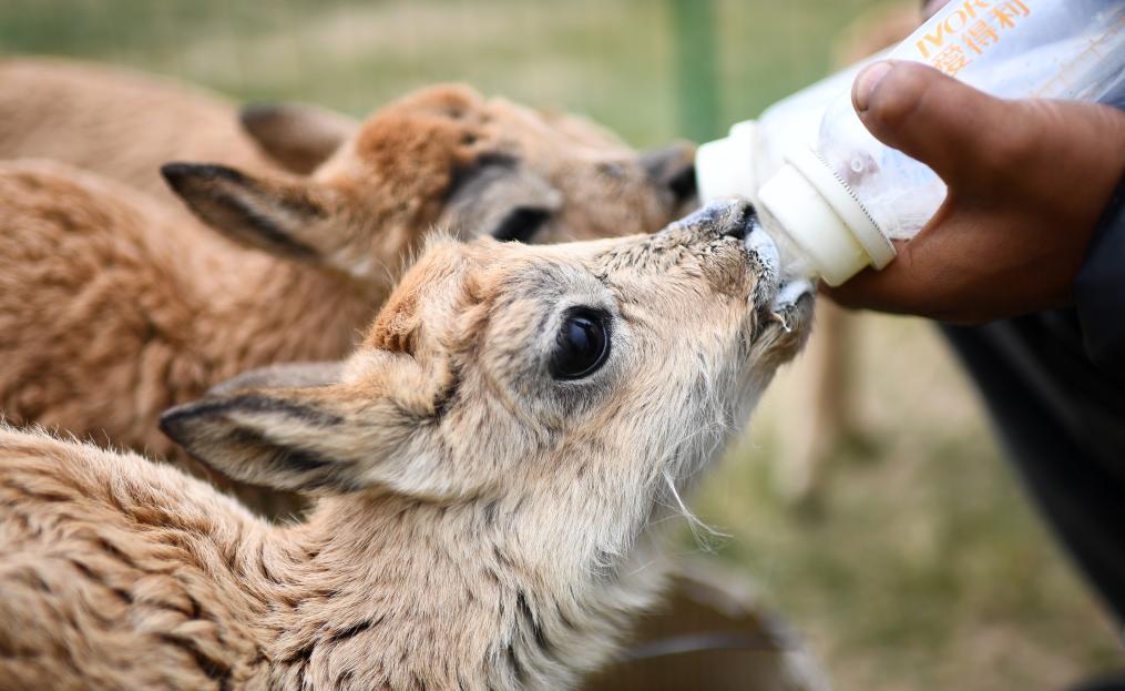 可可西里管理處索南達杰保護站隊員才仁多杰在給被救助的藏羚羊幼仔喂奶(7月28日攝)。新華社記者 張宏祥 攝