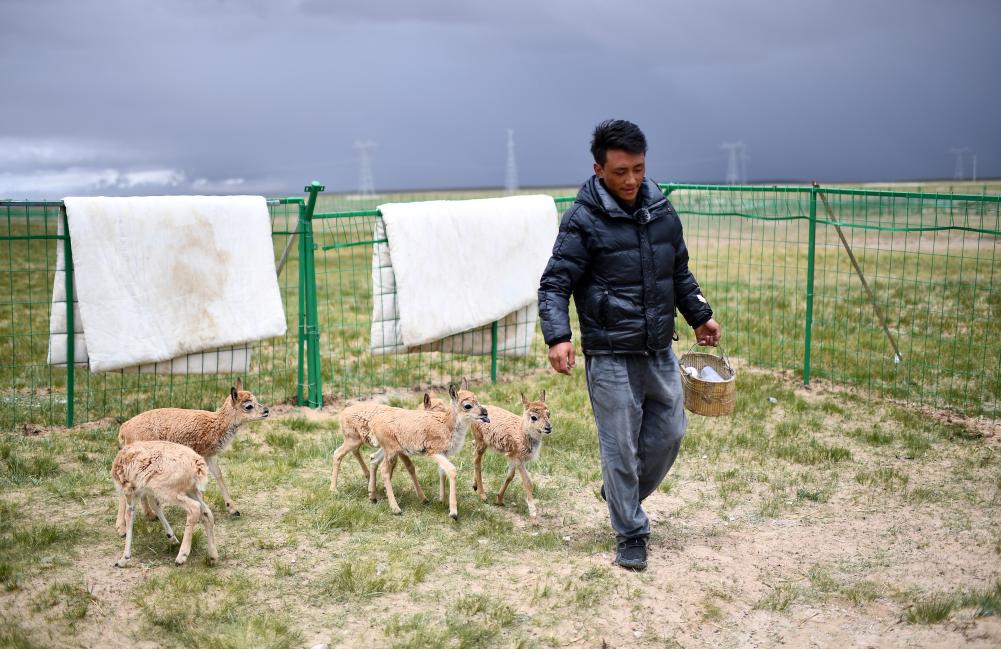 可可西里管理處索南達杰保護站隊員才仁多杰和被救助的藏羚羊幼仔在一起(7月28日攝)。新華社記者 張宏祥 攝