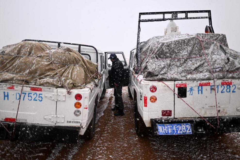可可西里管理處卓乃湖保護站隊員在前往卓乃湖保護站途中遭遇大雪(6月16日攝)。新華社記者 張宏祥 攝