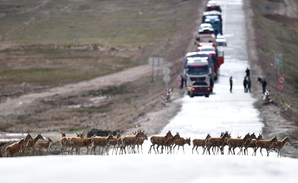 一群藏羚羊通過青藏公路前往青海三江源地區(qū)(7月28日攝)。新華社記者 張宏祥 攝