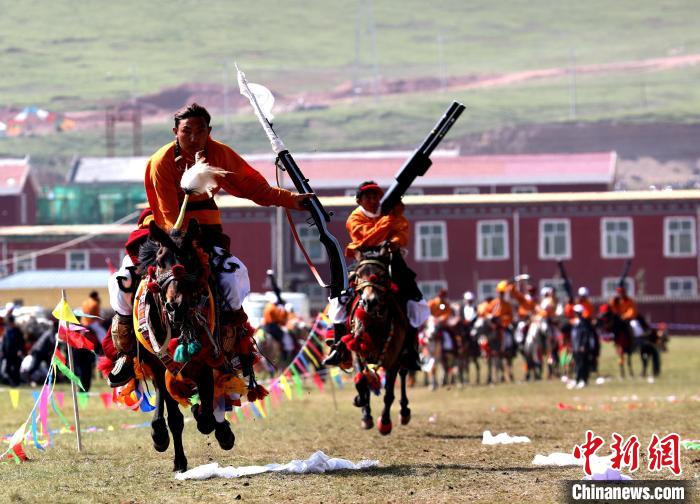 資料圖為玉樹州雜多縣瀾滄江源生態(tài)文化旅游系列活動開幕式上的馬術(shù)表演。薛蒂 攝