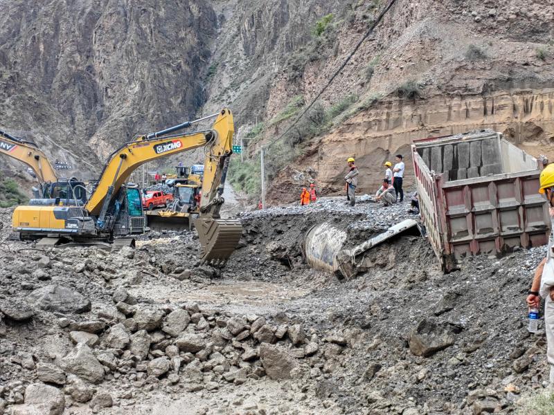 近日,受持續(xù)強降雨影響,G214線佛山鄉(xiāng)古水村附近K1911+750處發(fā)生泥石流災害,造成交通中斷。德欽公路分局立即啟動汛期保通應急預案,第一時間組織應急搶險人員趕赴現(xiàn)場,4臺裝載機、2臺挖掘機、4臺運輸車全力投入搶通工作中,并協(xié)同交警實行交通管制,疏散滯留車輛。經(jīng)過多部門搶險保通作業(yè),受阻路段順利實現(xiàn)半幅通行。圖為現(xiàn)場正在清理鏟運泥沙。
