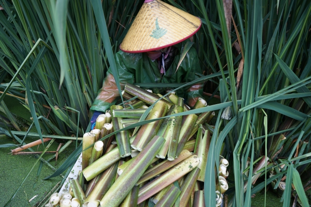 走到田間,只見(jiàn)十余名務(wù)工人員腳穿水鞋,頭頂斗笠,手拿彎刀向下一揮,再去頭割尾,一顆光潔的茭白便采割完成了。采割好的茭白在岸邊經(jīng)過(guò)簡(jiǎn)單清洗后,便運(yùn)往冷庫(kù)包裝,銷(xiāo)往各地。