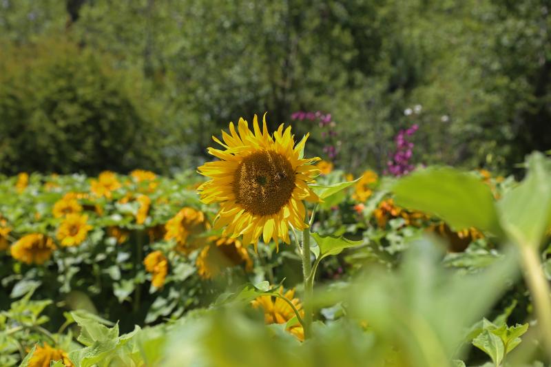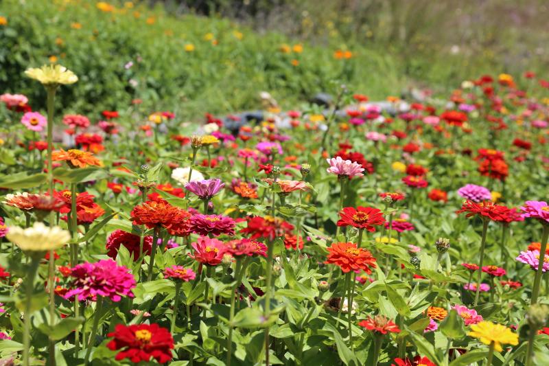 田間萬壽菊、百日菊、黑心菊、向日葵等簇?fù)硎⒎?,萬里晴空下,朵朵菊花在秋風(fēng)中搖曳生姿,蜜蜂飛舞、蝴蝶翩躚,繪出了一幅色彩繽紛的秋日畫卷,令人賞心悅目。
