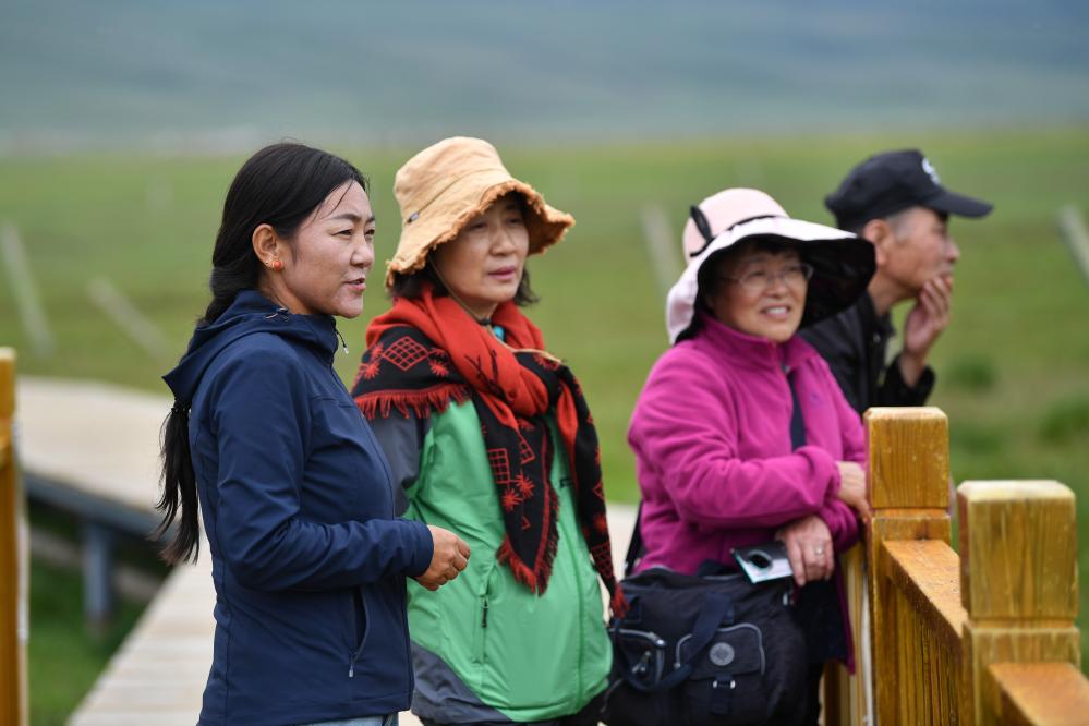 甘肅尕海則岔國家級自然保護(hù)區(qū)管護(hù)中心尕海保護(hù)站站長香毛吉(左一)向游客介紹保護(hù)區(qū)的野生動植物情況。 新華社記者 陳斌 攝