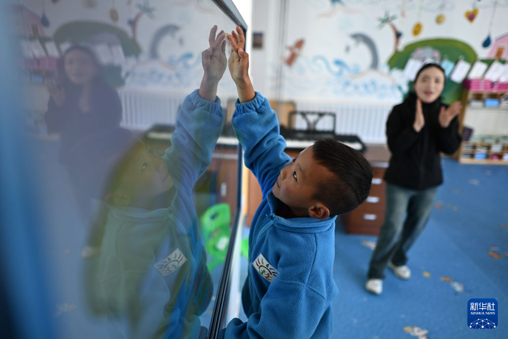 在曲麻萊縣秋智鄉(xiāng)幼兒園,教師索南(左一)在課堂上和義西卓瑪(右二)玩游戲(9月13日攝)。新華社 張宏祥 攝