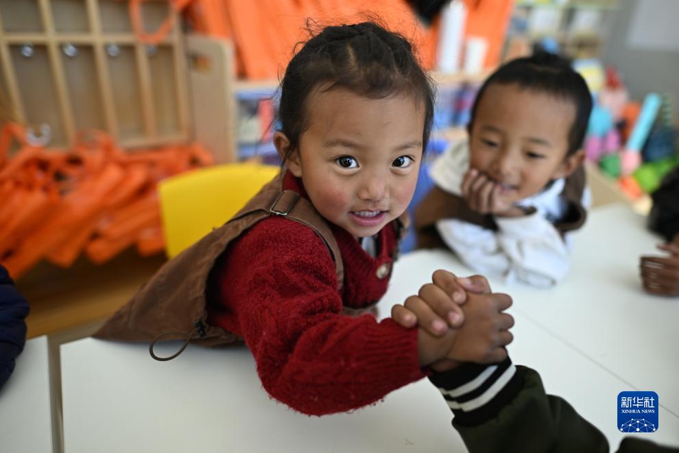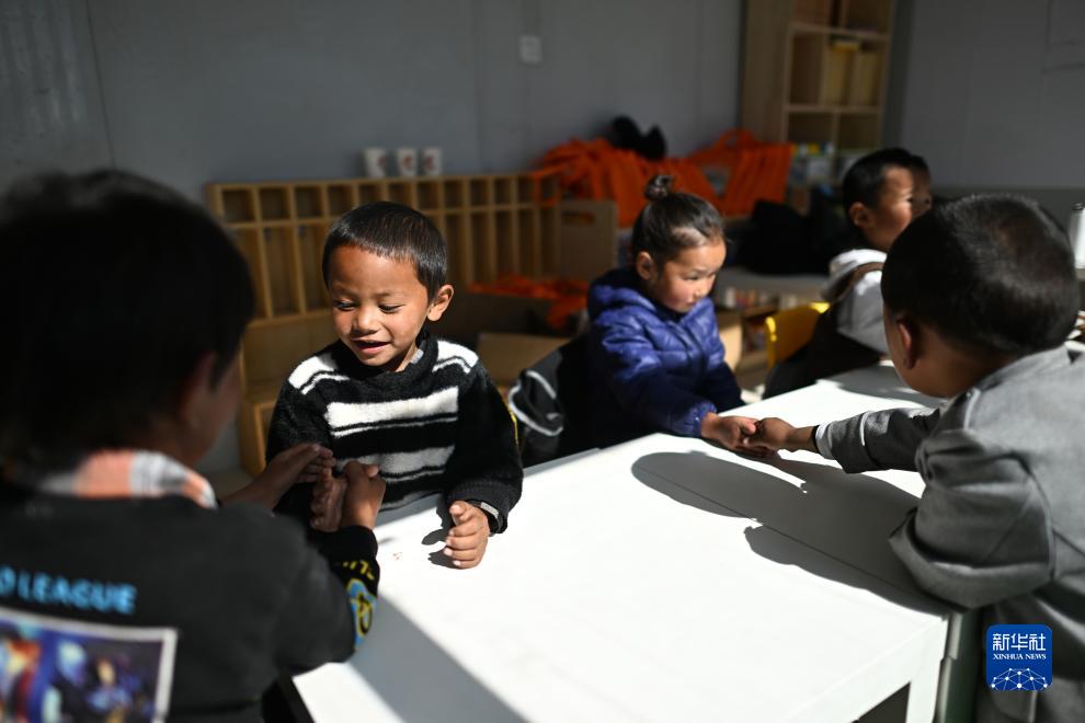 在青海省玉樹藏族自治州曲麻萊縣秋智鄉(xiāng)布甫村陽(yáng)光幼兒園,丁增巴桑(左)和伙伴們?cè)诮淌覂?nèi)玩耍(9月14日攝)。新華社記者 張宏祥 攝