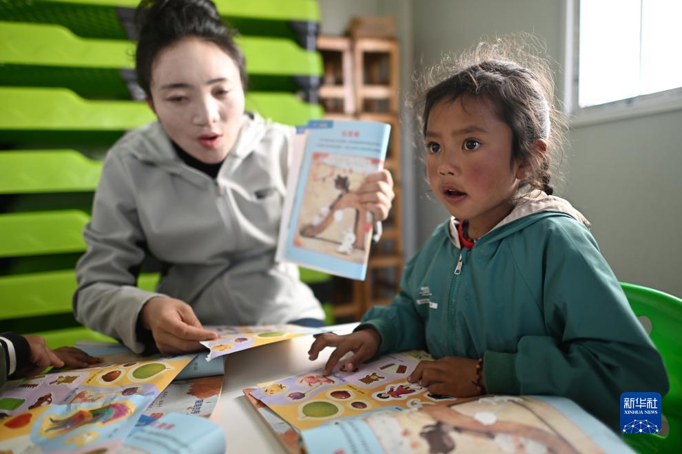 在青海省玉樹藏族自治州曲麻萊縣秋智鄉(xiāng)布甫村陽(yáng)光幼兒園,索南卓瑪(右)在課堂上(9月14日攝)。新華社記者 張宏祥 攝