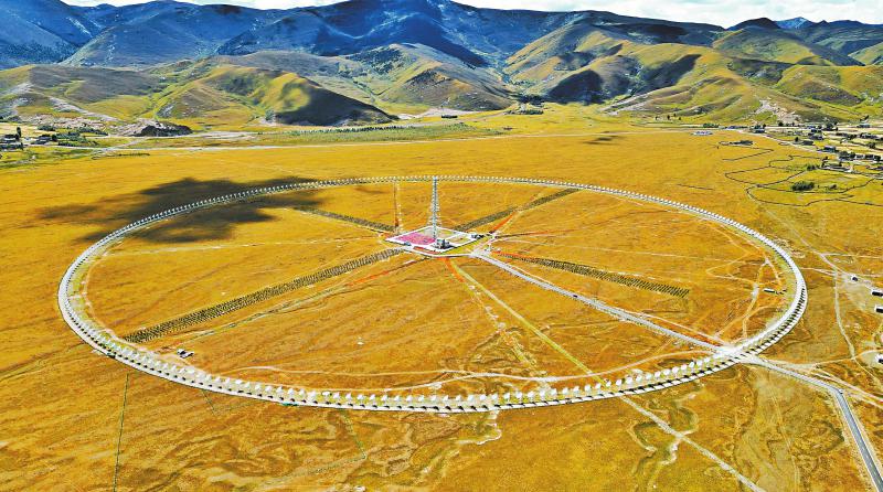 飛機從稻城亞丁機場起飛,右側舷窗外的地面隱現(xiàn)一個小圓點,因為造型特殊,當?shù)厝朔Q“千眼天珠”。小圓點其實一點也不“小”——在海拔3820米的四川省甘孜州稻城縣噶通鎮(zhèn),313部直徑6米的天線,均勻地分布在直徑1公里的圓環(huán)上。它的正式名字叫圓環(huán)陣太陽射電成像望遠鏡(下稱“圓環(huán)陣”),是國家重大科技基礎設施空間環(huán)境地基綜合監(jiān)測網(wǎng)(子午工程二期)的標志性設備之一,也是目前已建成的全球規(guī)模最大的綜合孔徑射電望遠鏡。其任務主要是對太陽和日地空間傳播鏈條進行高質量監(jiān)測,監(jiān)測太陽“打噴嚏”。
