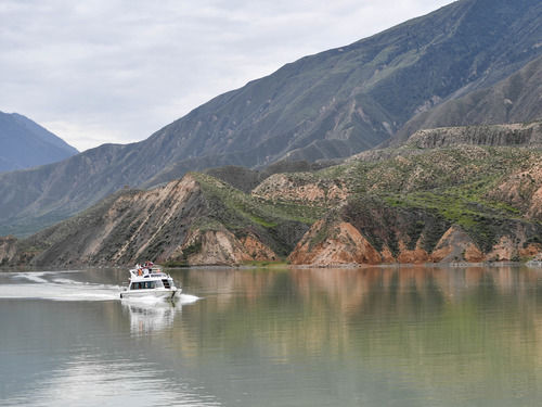 游客乘坐游艇在尖扎縣昂拉鄉(xiāng)德吉村附近的黃河游玩(2020年8月11日攝)。新華社記者 張龍 攝