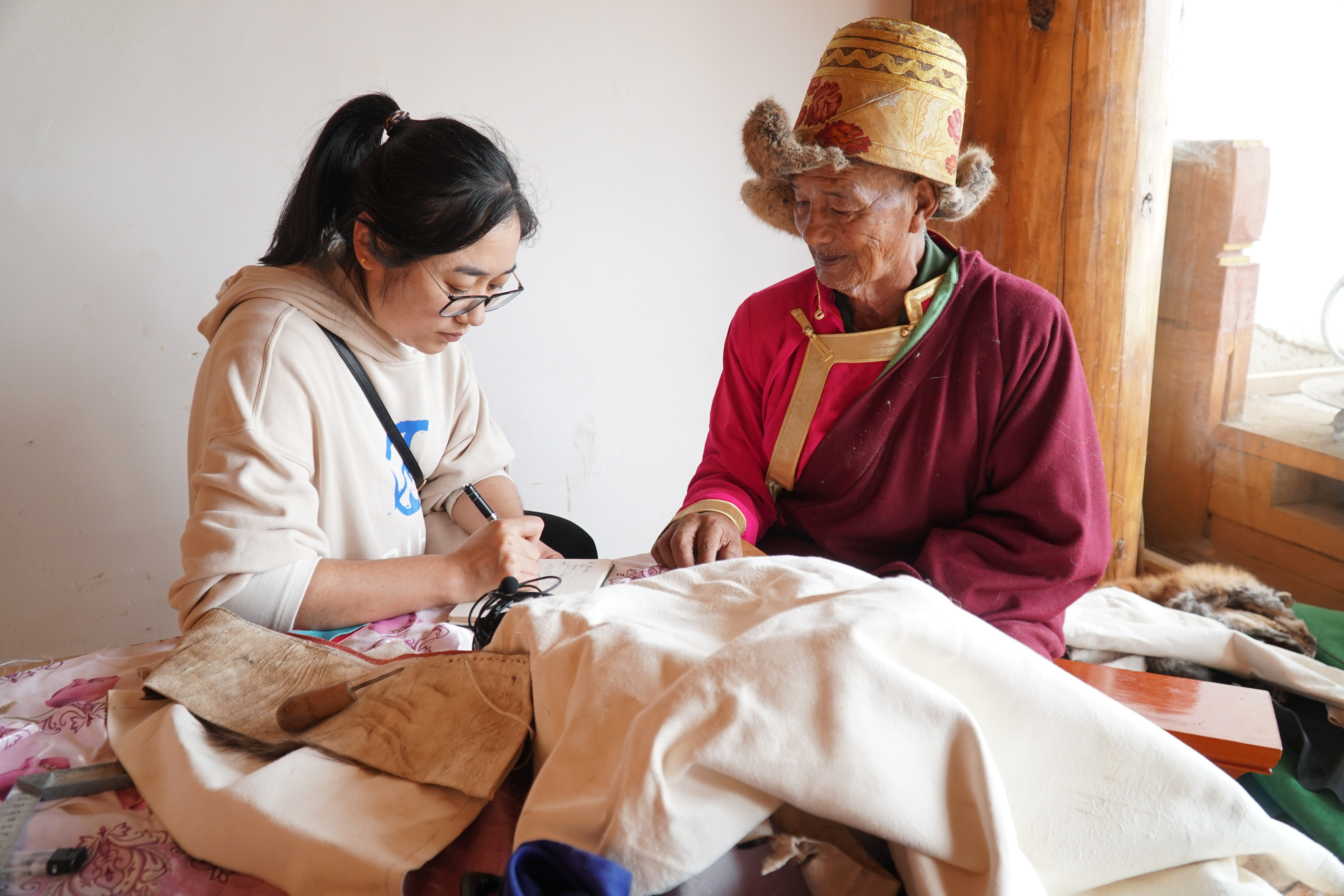 迪慶日?qǐng)?bào)社記者萬瑪措在香格里拉市小中甸采訪州級(jí)皮革制作技藝傳承人。