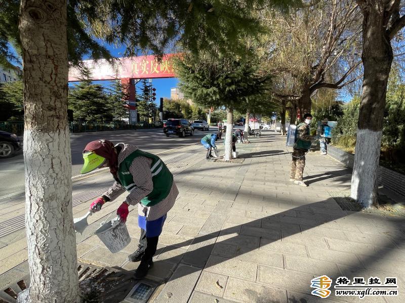 入冬以來,為保障樹木“安全健康”過冬,香格里拉市有關(guān)部門在城區(qū)主次干道、公園、廣場對樹木進(jìn)行涂白,這是入冬后樹木養(yǎng)護(hù)管理的一項措施,可以有效防止樹木遭受蟲害和凍害。圖為綠化工人一手提漆桶、一手拿刷子,在康珠大道將綠化樹主干逐一涂白。( 此里只瑪攝)