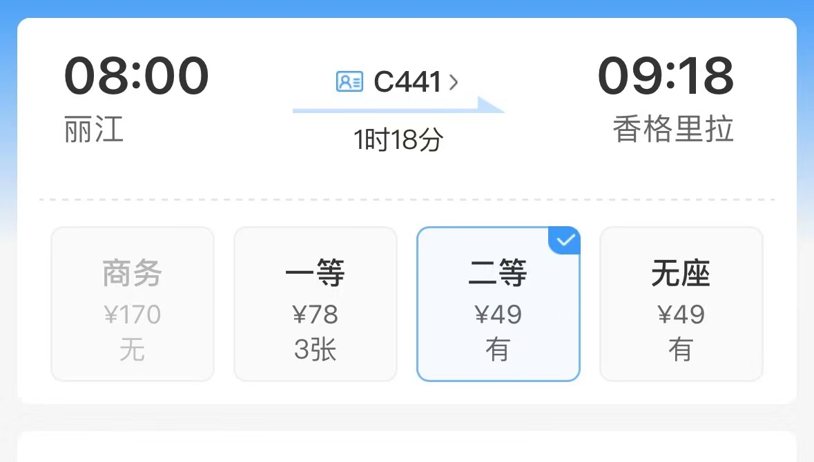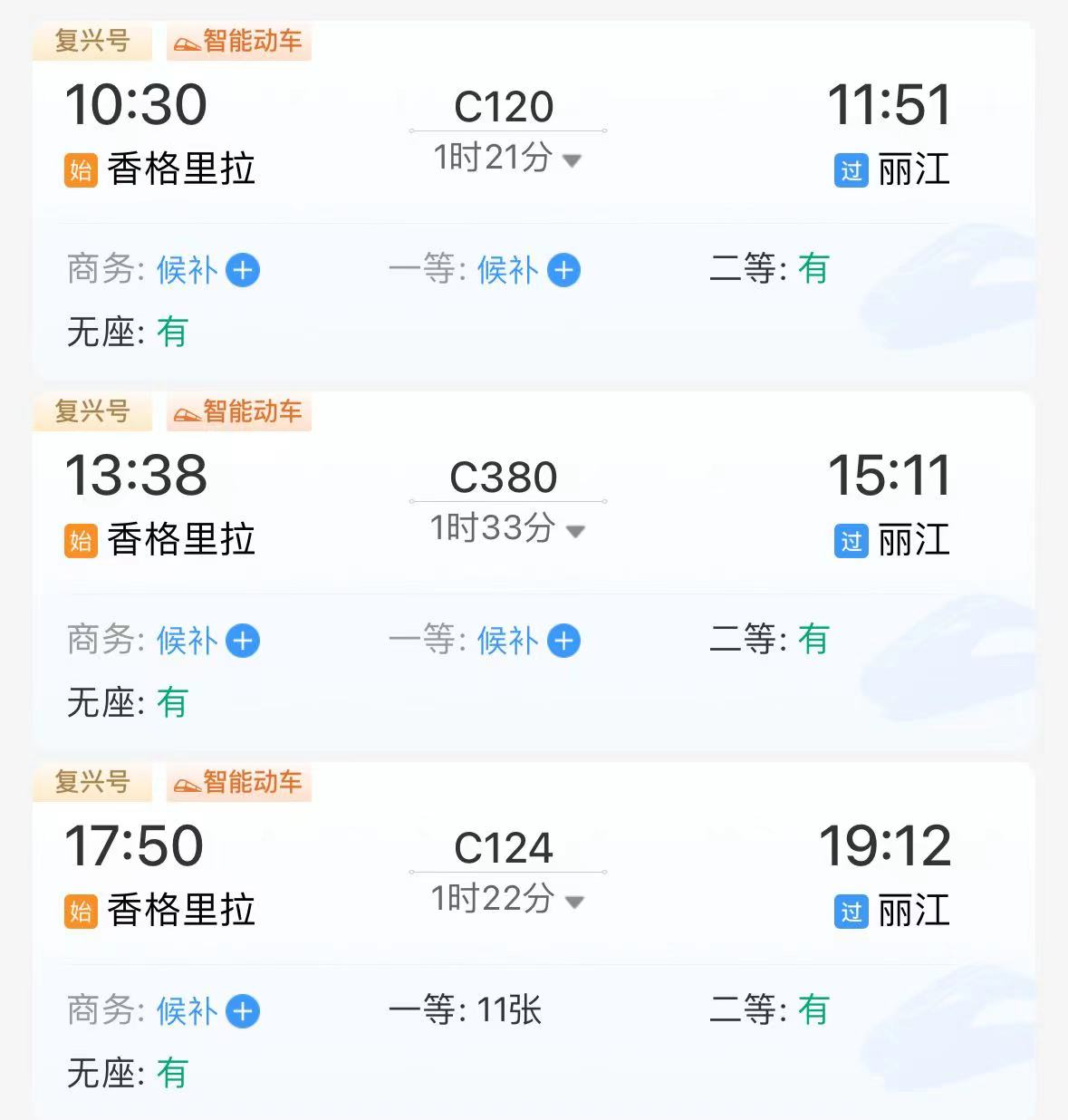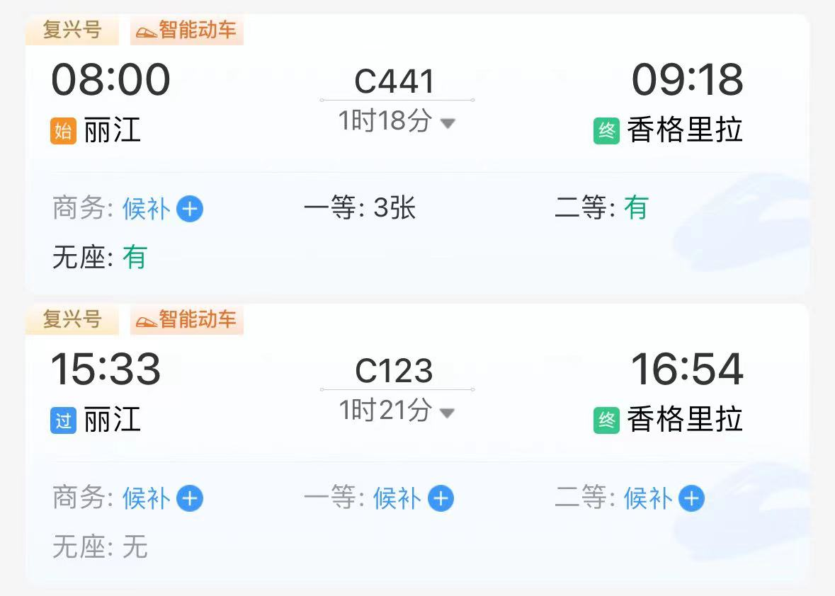 麗香鐵路開通至今熱度較高,鐵路12306購票平臺(tái)顯示,多趟班次已出現(xiàn)坐票售罄或無票的情況。根據(jù)香格里拉站工作人員建議,為保證沿線其他車站乘客購票,APP票量實(shí)時(shí)變動(dòng)更新,建議買不到票的乘客實(shí)時(shí)刷新APP,買不到坐票的乘客可以上車后向乘務(wù)員詢問各車廂是否有空余座位。