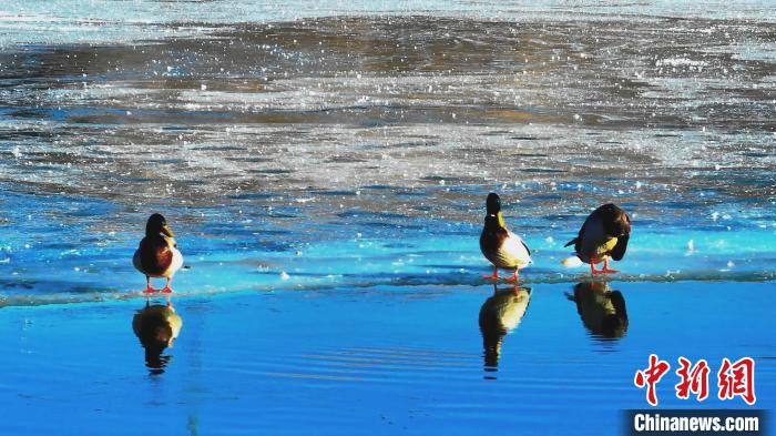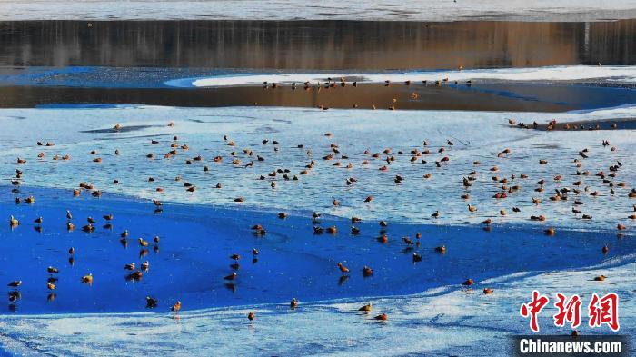 高原冬日,在位于青海湖北岸的青海省海北藏族自治州海晏縣境內(nèi),成群的赤麻鴨、綠頭鴨等鳥類現(xiàn)身青海省東大灘水庫,它們時(shí)而“泡湯”洗浴,時(shí)而振翅高飛,時(shí)而覓食嬉戲,展現(xiàn)出一幅冬日和諧的美好畫面。近年來,越來越多鳥類來到青海湖北岸覓食休憩,此時(shí)一半冰層一半碧波的東大灘水庫成了鳥類覓食的好去處。