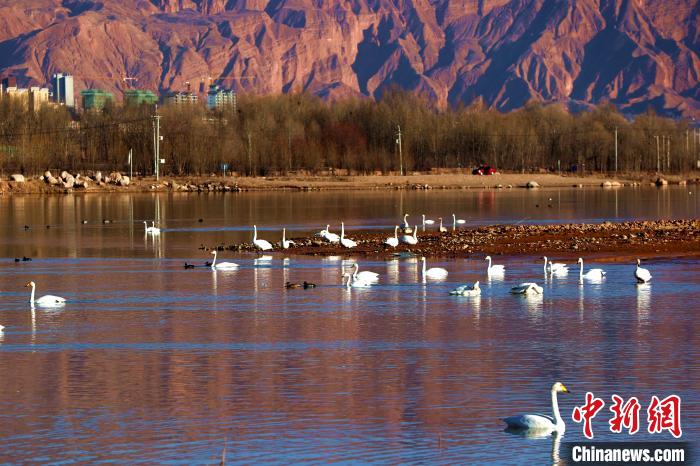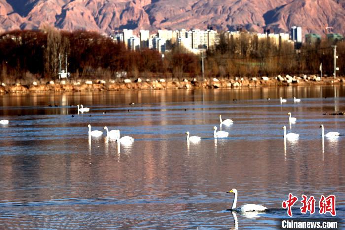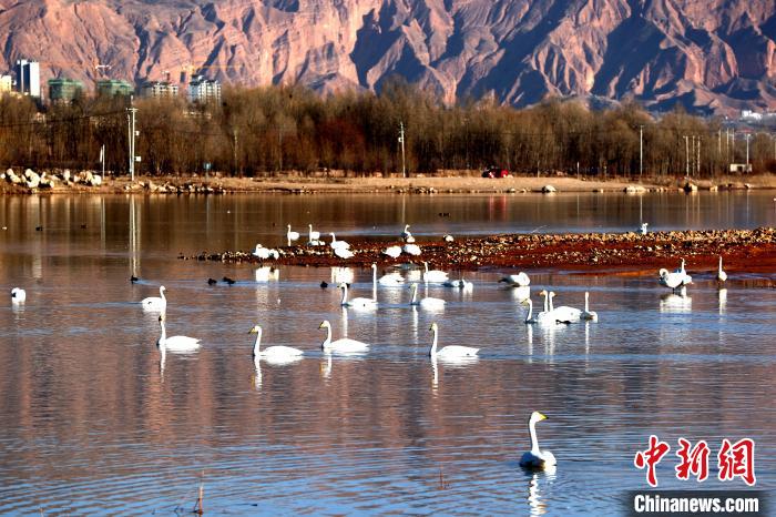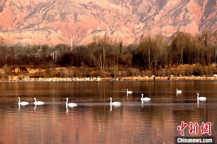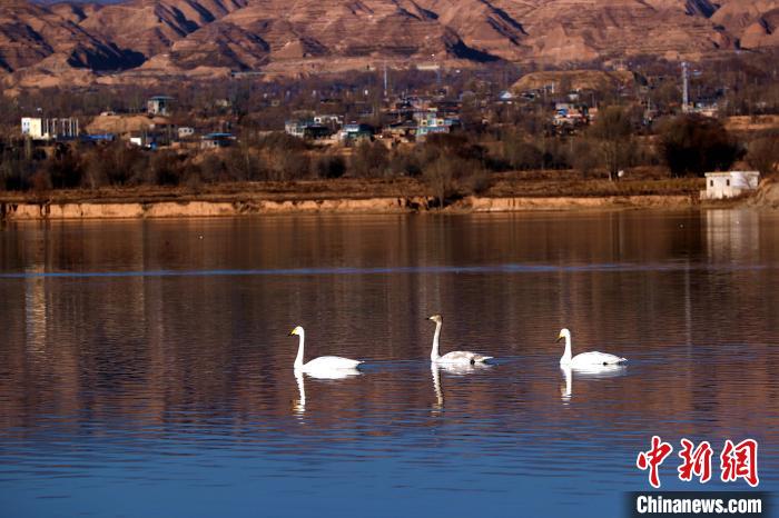 12月8日,記者前往青海省黃南藏族自治州尖扎縣,在母親河黃河河畔看到成群結隊的野生大天鵝在此棲息越冬,或暢游湖面,或振翅高吟。野生大天鵝群的到來,為冬天的黃河上游增添靈氣,勝似一群潔白的精靈“躍”動在冬日的高原大地。