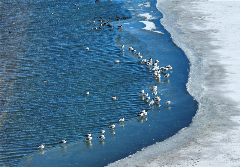 魚鷗在結(jié)冰的青海湖邊覓食。郭輝忠 攝