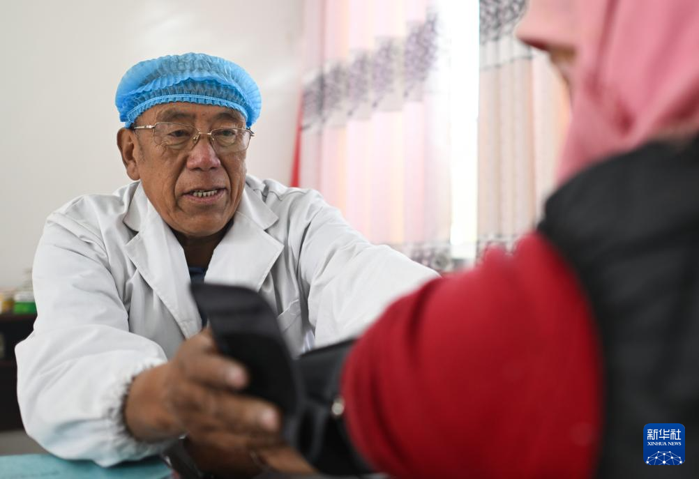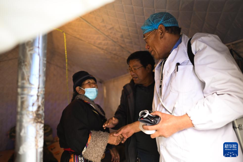 12月22日,完么仁增在牙木村應急醫(yī)療點為村民量血壓。新華社記者 張龍 攝