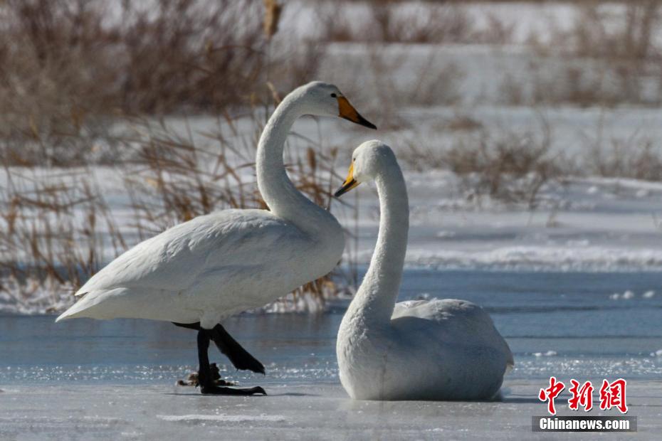 天鵝在湖冰上休憩。青海可魯克湖-托素湖省級自然保護(hù)區(qū) 供圖