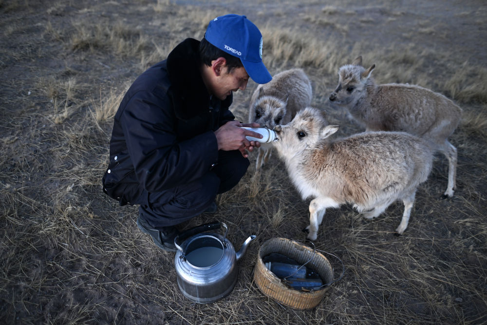 可可西里巡山隊員才文多杰在索南達杰保護站內給被救助的藏羚羊幼仔喂奶(1月18日攝)。新華社記者 張宏祥 攝