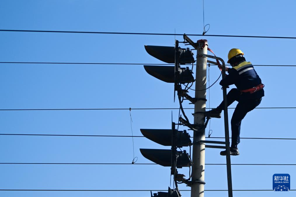 1月29日,格爾木電務段格爾木東信號車間察爾汗信號工區(qū)職工何江東在高柱信號機上檢查信號機安裝螺絲是否緊固。新華社記者 張龍 攝