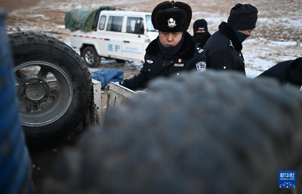 在可可西里可考湖區(qū)域附近,可可西里森林公安局不凍泉派出所所長詹江龍(左一)準(zhǔn)備搬運生活物資(1月19日攝)。新華社記者 張宏祥 攝