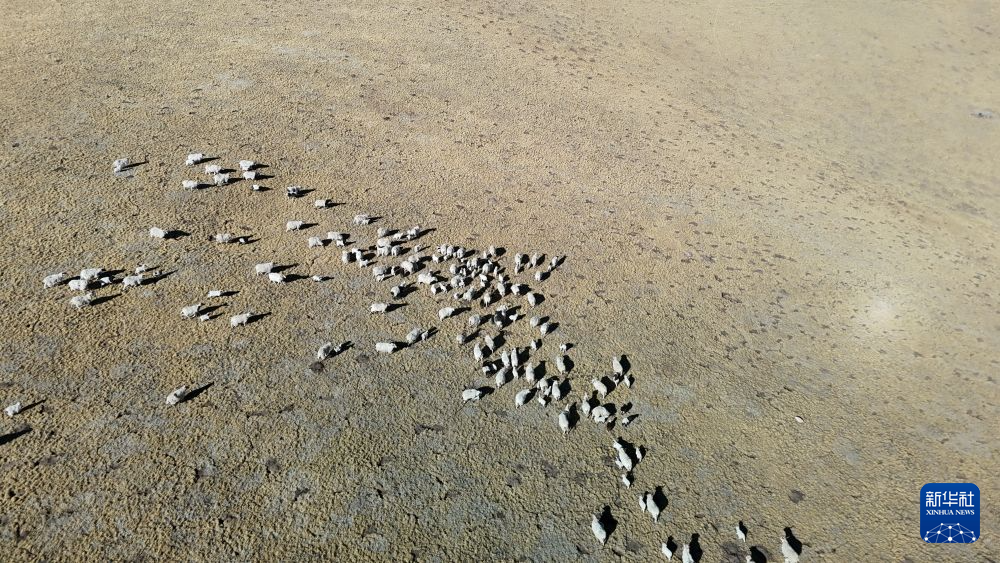 1月27日,在青海省海北藏族自治州剛察縣泉吉鄉(xiāng)寧夏村,羊群正在覓食(無(wú)人機(jī)圖片)。任元昊 攝