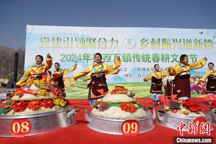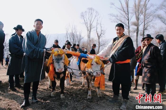 3月6日,青海省海南藏族自治州貴德縣拉西瓦鎮(zhèn)舉辦春耕文化節(jié)活動。該鎮(zhèn)十個村的村民身穿節(jié)日盛裝,手捧制作精美、色彩鮮艷,寓意風調雨順、五谷豐登的“彤糕”來到田間,以“二牛抬杠”的傳統(tǒng)方式開啟今春“第一犁”。