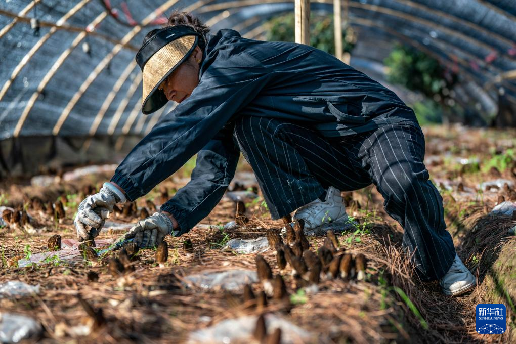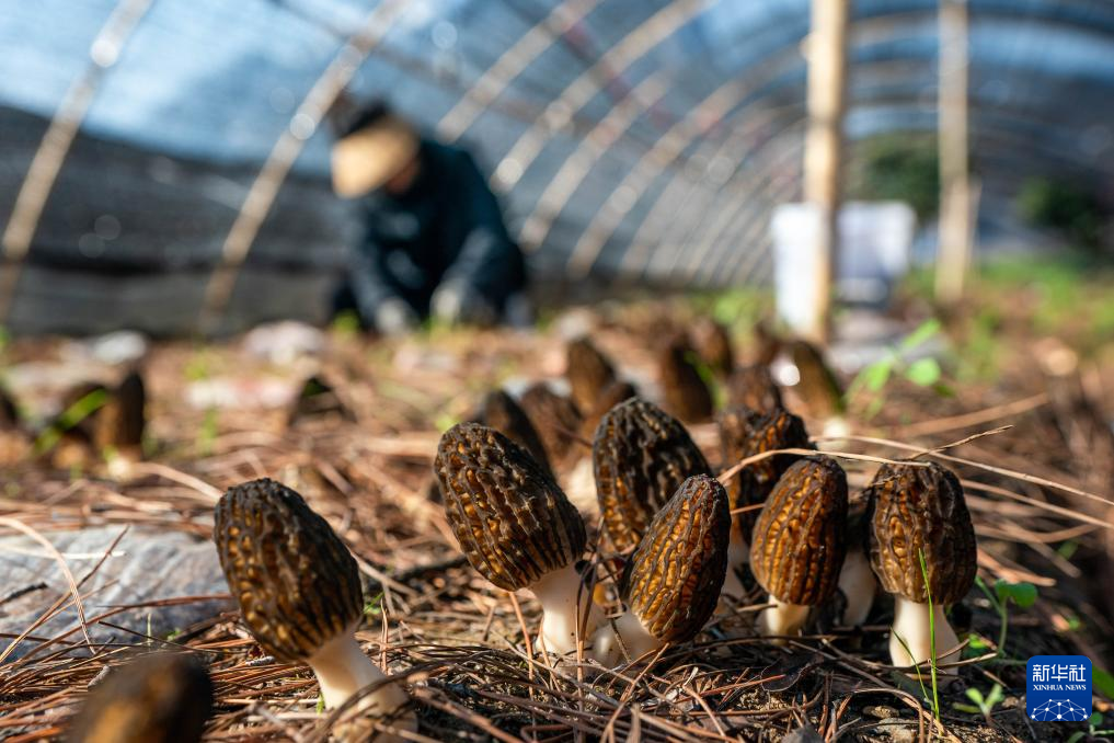 3月10日,在香格里拉市三壩納西族鄉(xiāng)江邊村,村民在大棚里采收羊肚菌。新華社記者胡超 攝