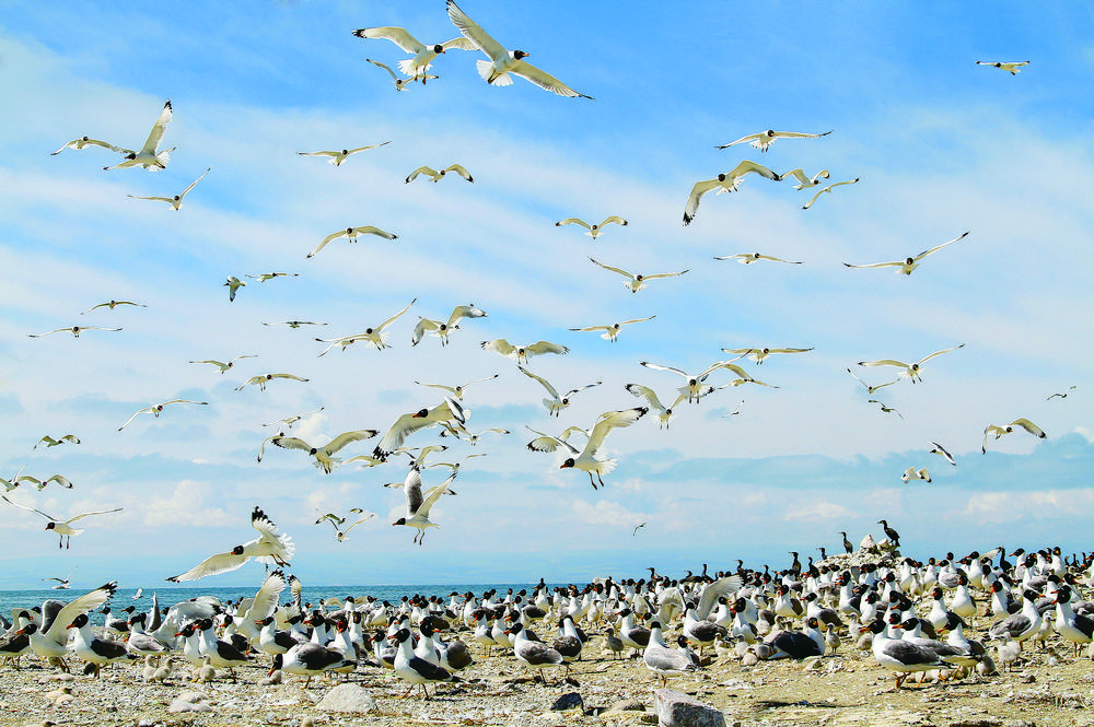 候鳥(niǎo)北歸,青海湖又將進(jìn)入一年中最美麗的時(shí)節(jié)。浮想盛夏時(shí)節(jié),棕頭鷗、漁鷗、斑頭雁、普通鸕鶿等水鳥(niǎo),或成群在低空中擺著“隊(duì)形”,或“拖家?guī)Э凇痹谒嫔湘覒蛲嫠?,或和洄游的湟魚(yú)上演魚(yú)鷗“大戰(zhàn)”,碧波蕩漾的青海湖將美得如詩(shī)如畫。(本版圖片除署名外,其他均由青海湖景區(qū)保護(hù)利用管理局提供)
