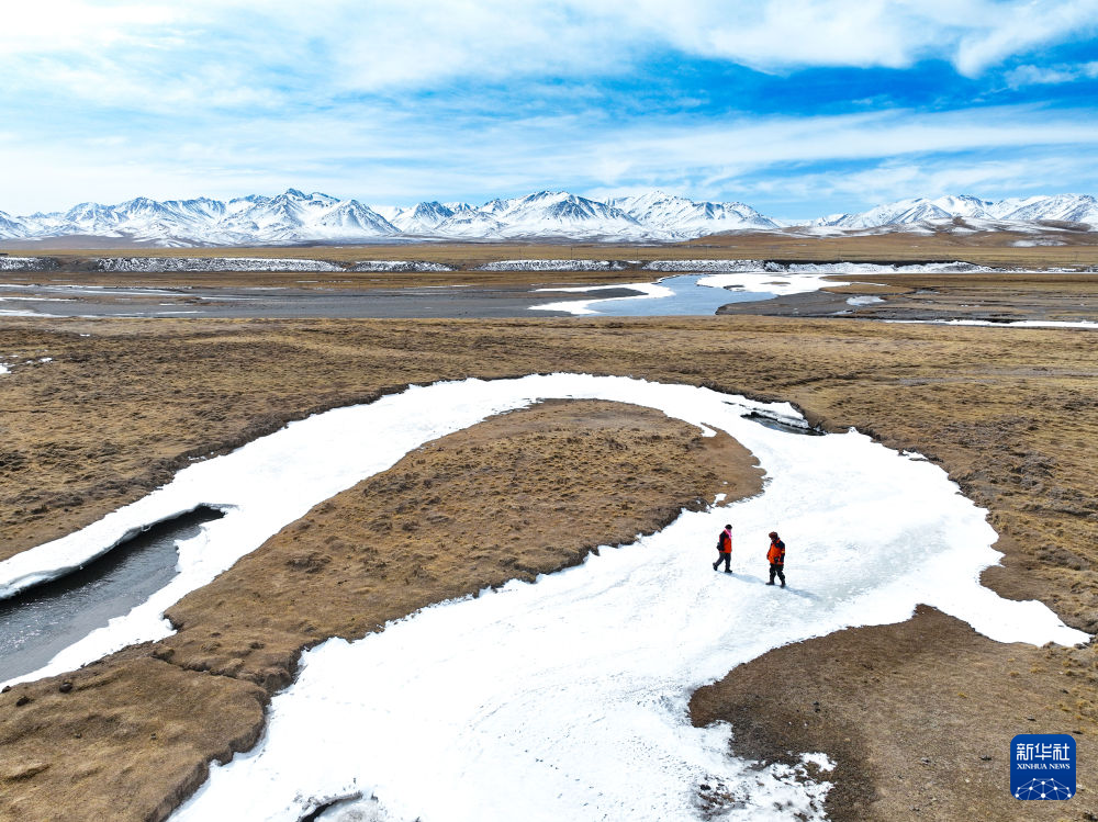 3月21日,葉金俄日(右)與東木措在青海省海北藏族自治州祁連縣的黑河流域巡護(無人機照片)。新華社記者 張龍 攝