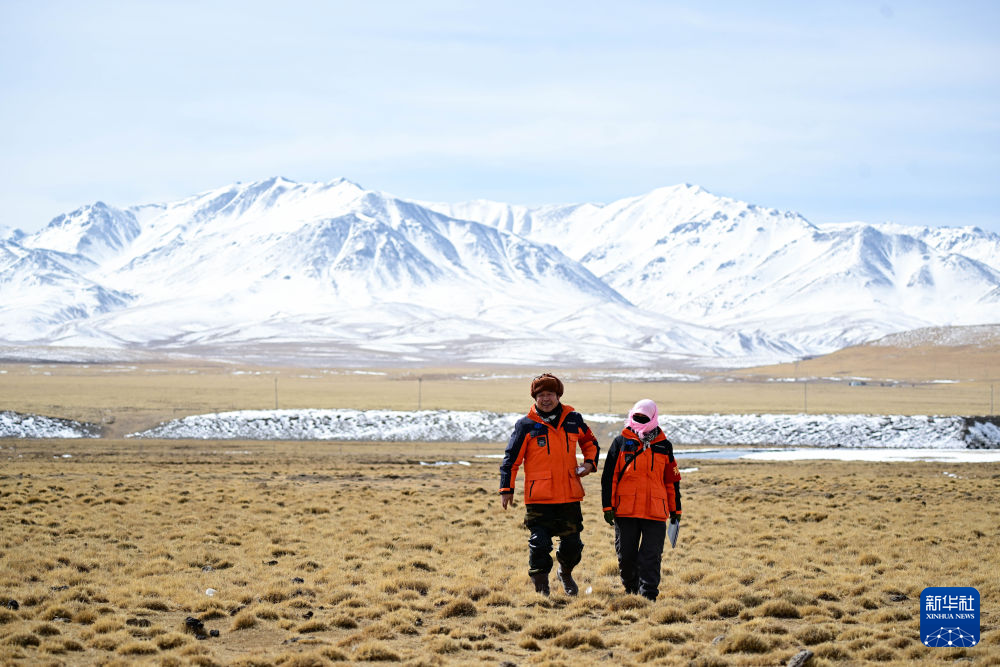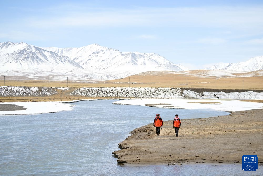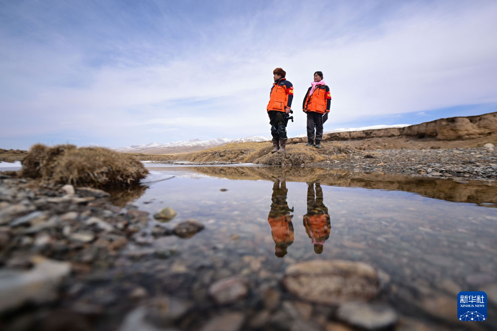 3月21日,葉金俄日(右)與東木措在青海省海北藏族自治州祁連縣的黑河流域巡護。新華社記者 張龍 攝