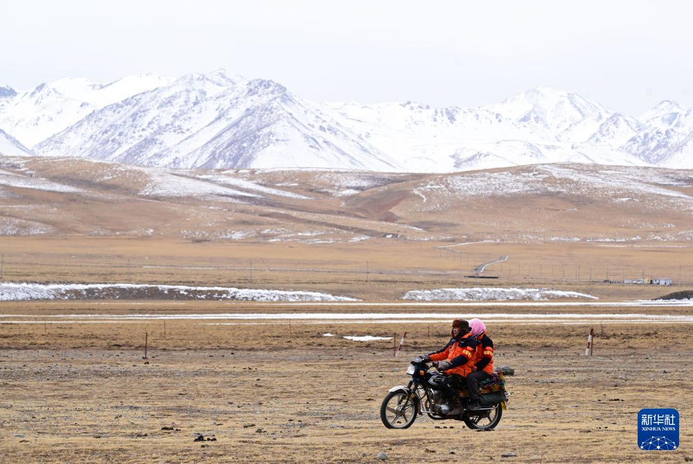 3月21日,葉金俄日與東木措騎著摩托車在青海省海北藏族自治州祁連縣的黑河流域巡護。新華社記者 張龍 攝