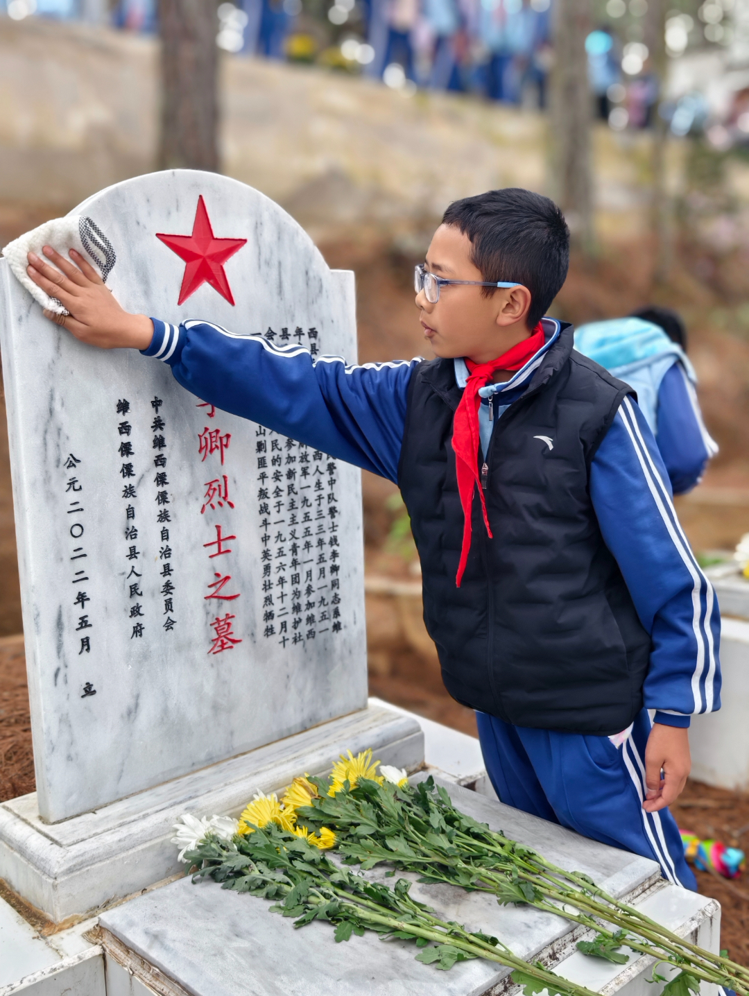 4月3日清晨,州民族中學(xué)在香格里拉烈士陵園開展了一堂生動(dòng)的愛國主義教育課。師生們手持菊花,神情莊重,集體向英烈們鞠躬、默哀、敬獻(xiàn)鮮花,表達(dá)心中的緬懷、敬仰之情,隨后繞烈士紀(jì)念碑一圈,默默觀看革命歷史浮雕。隨后同學(xué)們拿起衛(wèi)生工具進(jìn)行掃墓。有的同學(xué)清掃地上的塵土,有的同學(xué)用鉗子夾起地上的垃圾,有的同學(xué)用抹布擦拭墓碑……將烈士陵園打掃得干干凈凈。