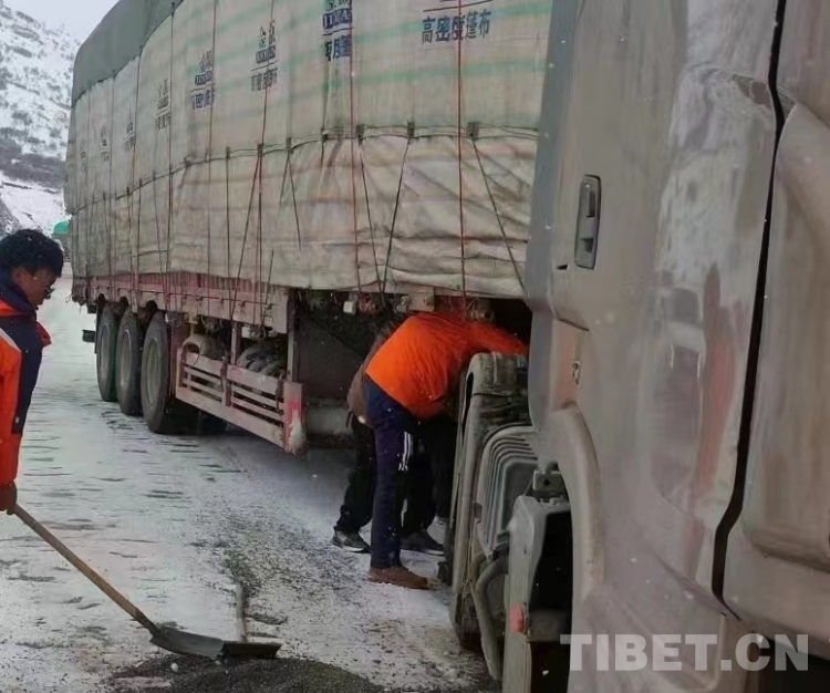 圖為公路養(yǎng)護者為打滑車輛拋灑防滑沙并上防滑鏈 供圖:澤旺卓瑪