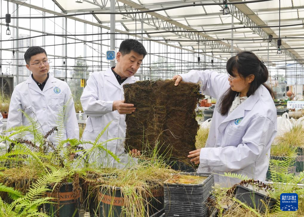4月20日,在成都理工大學(xué)生態(tài)環(huán)境學(xué)院教學(xué)實踐基地內(nèi),裴向軍(中)及團隊成員在展示其利用退化草皮培育的植生塊。新華社記者 劉坤 攝