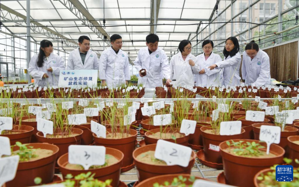 4月20日,在成都理工大學(xué)生態(tài)環(huán)境學(xué)院教學(xué)實踐基地內(nèi),裴向軍(左四)及團隊成員在討論礦山生態(tài)修復(fù)盆栽實驗。新華社記者 劉坤 攝