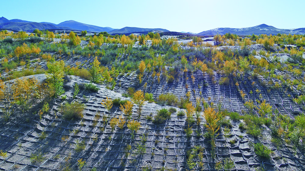 “白色方格就是沙障,用尼龍袋裝沙做成連片的方格,用來(lái)固沙。這些楊樹(shù)是沙地楊樹(shù)深栽旱作造林技術(shù)成果,選用1.5米左右的青楊苗木,在沙地中深挖1米進(jìn)行栽植?!?/p>