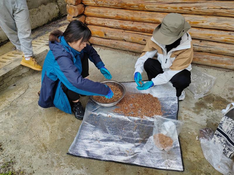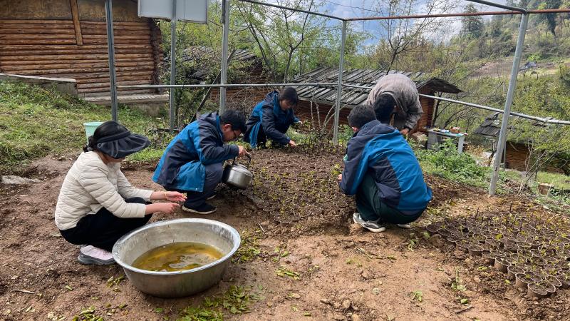 整地、施肥、裝袋、播種……救護(hù)站工作人員、響古箐社區(qū)婦女、駐站研究生分工合作,規(guī)?;嘤穗u嗉子(頭狀四照花)、領(lǐng)春木、水青樹等滇金絲猴主要食源植物幼苗共計(jì)2000余盆。