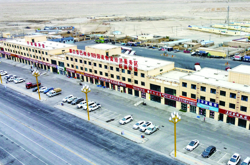 從都蘭縣城出發(fā),沿著109國道向西行駛100多公里,到達(dá)巴隆鄉(xiāng)109國道物流經(jīng)濟(jì)服務(wù)區(qū)。整個(gè)服務(wù)區(qū)干凈整潔,道路一側(cè)是一排黃色三層小樓,各類商鋪云集,樓前的空地上停放著不少車輛。